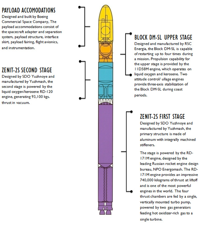 The Zenit-3SL rocket is a modern, heavy-lift vehicle capable of delivering large commercial spacecraft accurately to a range of orbits. The Zenit-3SL integrated launch vehicle is a liquid-propellant launch vehicle consisting of three stages plus the payload unit.  The Zenit-3SL can deliver 6,160 kilograms to the standard reference geosynchronous transfer orbit. The Zenit-3SL payload unit accommodates spacecraft up to 7,300 kilograms in a 4.1 meter diameter fairing.  Detailed performance information and interface capability can be found in the Sea Launch User’s Guide.