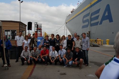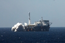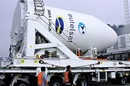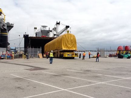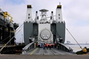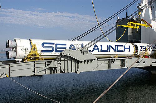 First stage of the Zenit-2S being offloaded from the Ocean Force transport vessel on July 14, 2011 |