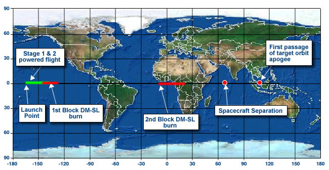 Two-and-a-half minutes after liftoff, the first stage and then the payload fairing jettisoned. Five minutes later, the second stage separated from the Block DM upper stage. After the first burn of the Block DM, the spacecraft and the upper stage coasted for 30 minutes over the Pacific Ocean, South America and the Atlantic Ocean. Following this coast, the Block DM executed a second burn for about seven minutes and then coasted again for about ten minutes until spacecraft separation over the Indian Ocean. Boeing Satellite Systems acquired a signal from the spacecraft at a ground station in Hartebeesthoek, South Africa nearly six hours later.