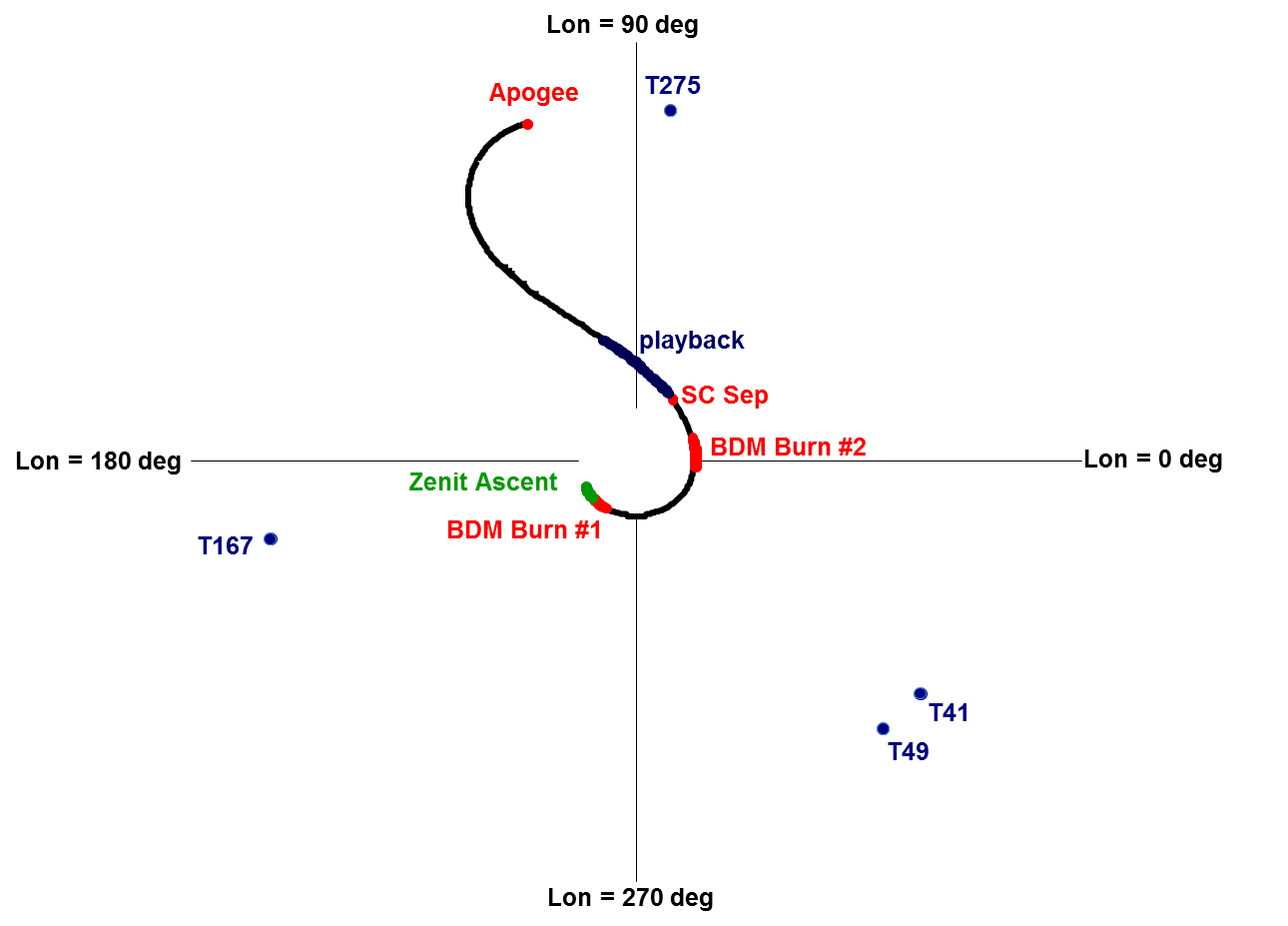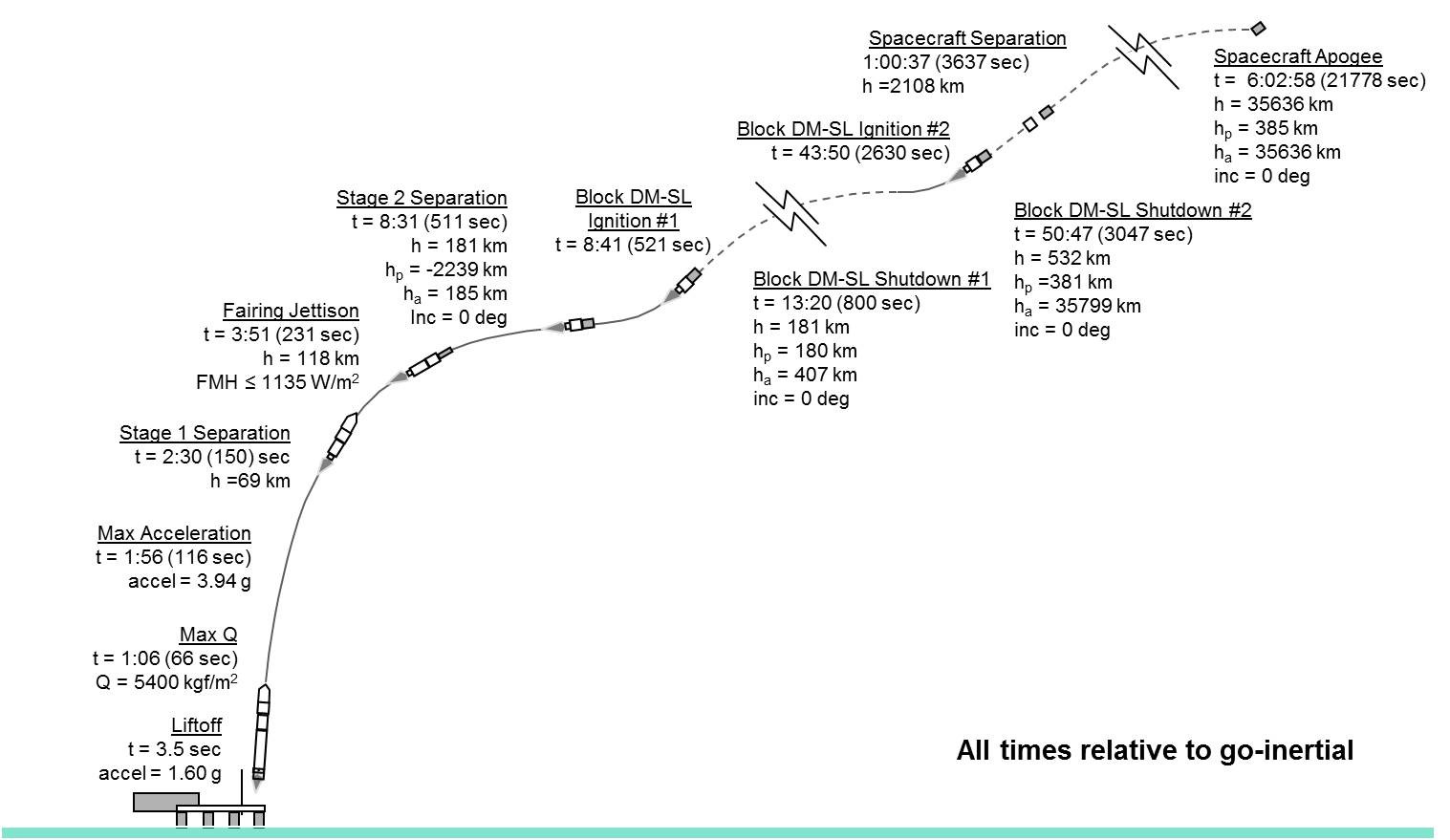 The Zenit-3SL rocket will begin its ascent phase of flight. The first stage of the vehicle will separate 2:30 minutes (150 seconds) after liftoff, and the protective payload fairing will be jettisoned 81 seconds later at 3:51 minutes into the flight. The second stage will conduct a 6 minute burn, followed by its separation from the Block DM-SL upper stage. The Block DM-SL will begin its first of two burns at 8:41 minutes (521 seconds) into the mission, for the duration of 279 seconds. The upper stage will then shut down for a 30.5 minute coast period, followed by the start of the second burn at 43:50 minutes into the mission. Spacecraft separation is expected at 1 hour after liftoff, over the Indian Ocean